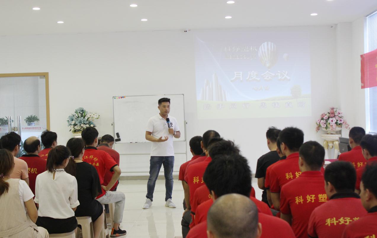 2019年8月1日下午4點(diǎn)。今天是個(gè)特殊的日子,浙江科好塑料機(jī)械有限公司月度會(huì)議于下午正式拉開帷幕。首先侯總在會(huì)上說:塑料造粒機(jī)市場(chǎng)是大有人在的,為什么客戶沒有選擇我們?要從我們自身找原因,我們自己的負(fù)責(zé)人員要專業(yè)性強(qiáng)。服務(wù)做到爭(zhēng)取做到110分??赡鼙静粚儆谀愕目蛻?,到最后選擇你。未來的的市場(chǎng)將規(guī)劃幾款新的產(chǎn)品系列, 讓客戶真正的實(shí)現(xiàn)從廢舊塑料回收到選材、粉碎清洗、造粒、切粒等一站式服務(wù)。讓客戶從我們這里從塑料回收再到塑料造粒整套設(shè)備,安全更高效,省錢更放心!